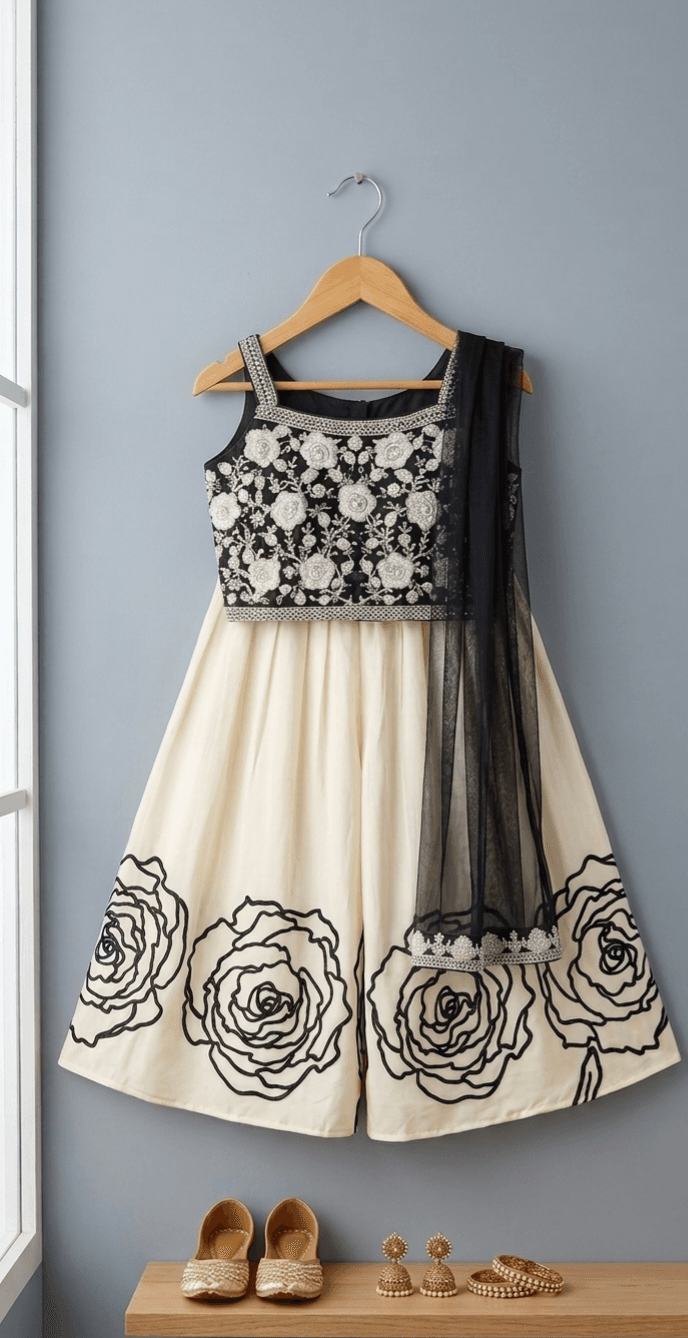Stitchkaa creates premium ethnic wear for kids that balances tradition with comfort. This black embroidered top and cream palazzo set combines bold floral artistry with a contemporary silhouette, ensuring your child stands out at every event. Discover more in our kids clothing collection.