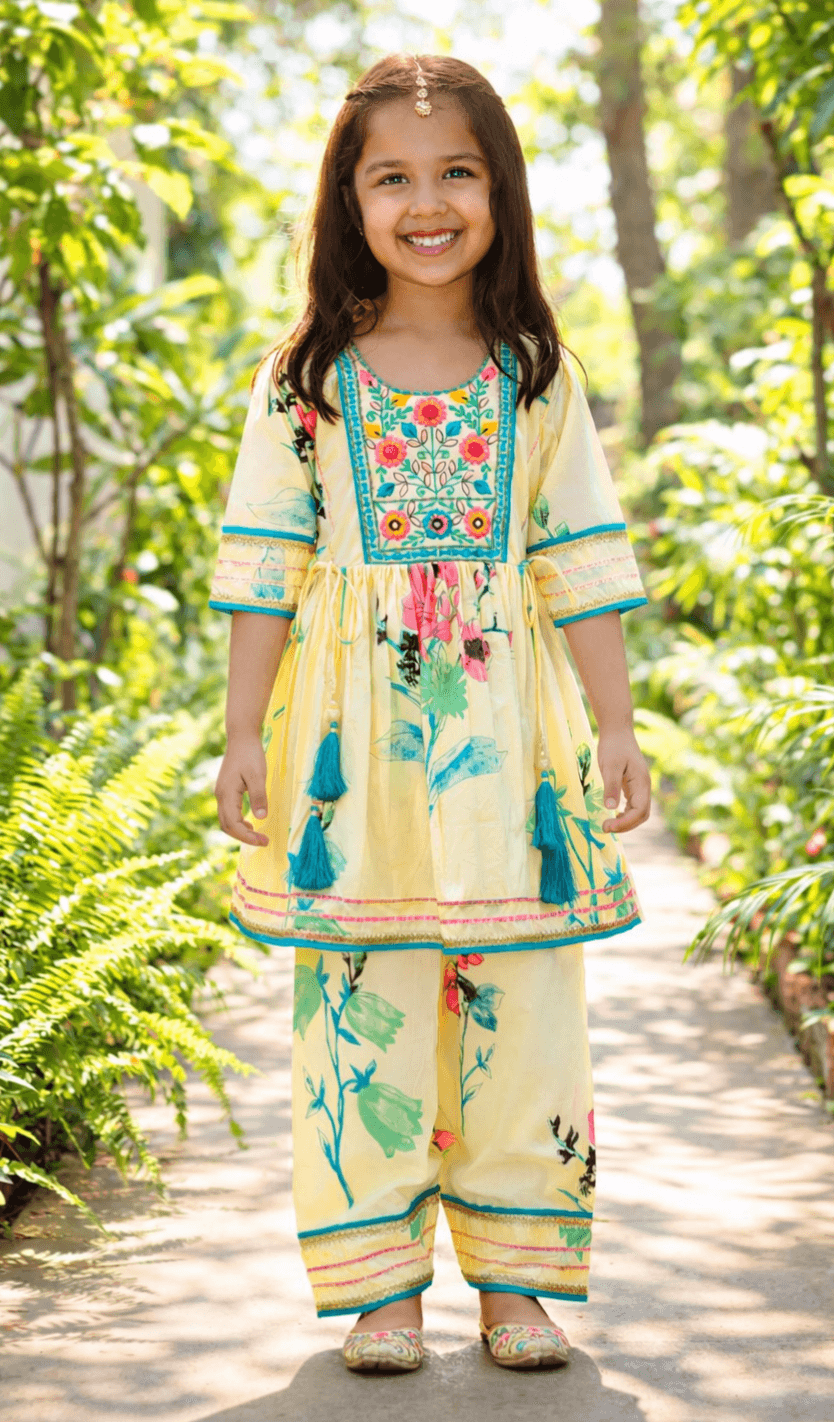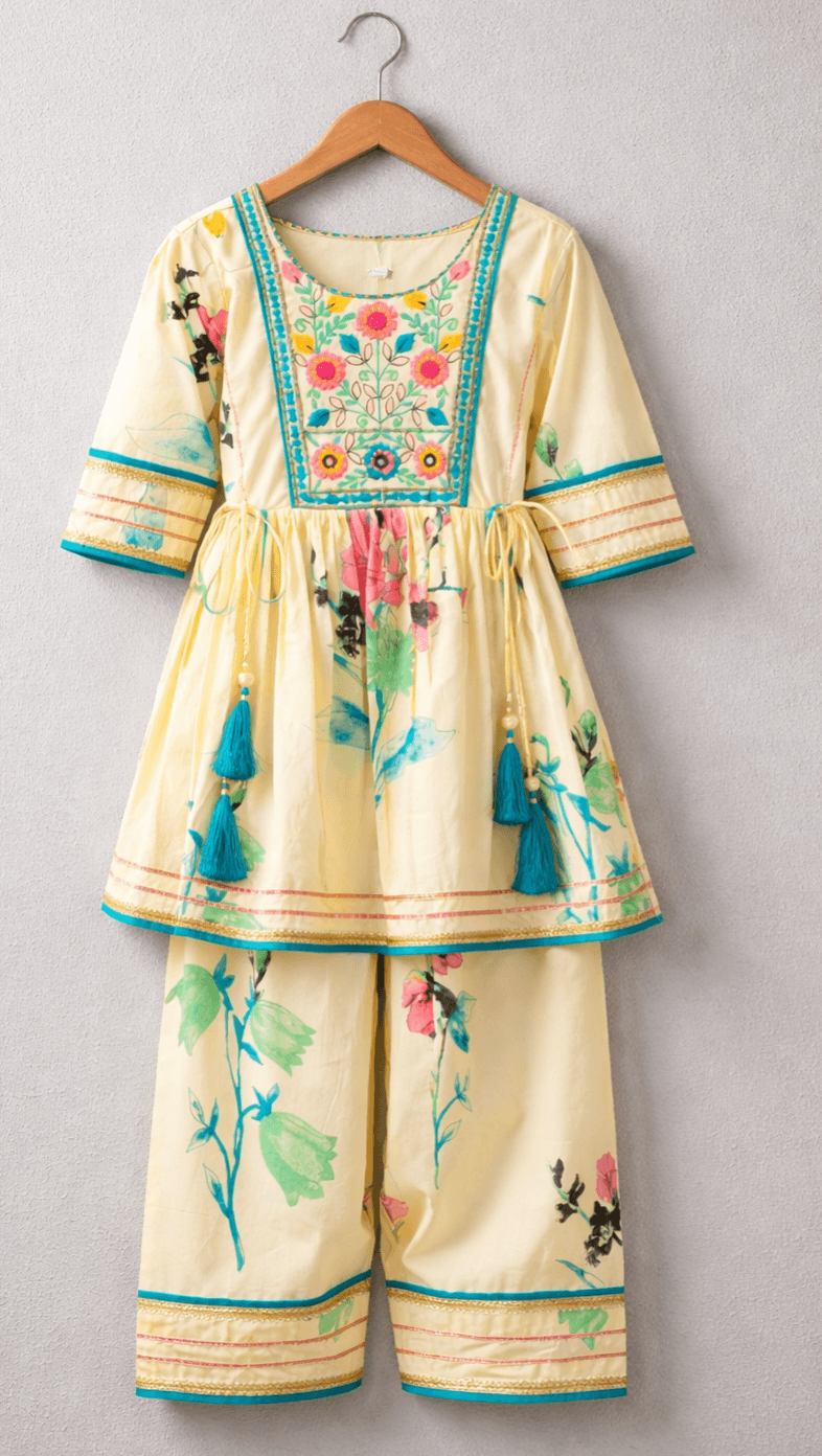 This cream embroidered kurta pant set for girls is a charming ethnic outfit perfect for weddings, festive occasions, and cultural celebrations. Featuring colorful floral embroidery on the chest, striped three-quarter sleeves with turquoise borders, and tassel details at the waist, it pairs beautifully with matching floral pants trimmed in turquoise and gold. Designed to blend traditional artistry with modern comfort, this set ensures your child looks radiant and feels confident. Explore more in our kids ethnic wear collection.