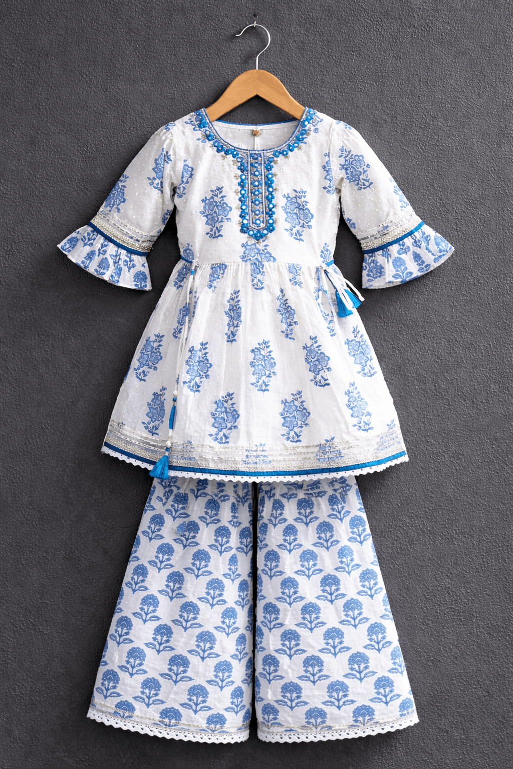 Stitchkaa creates premium ethnic wear for kids that balances tradition with comfort. This white kurta and blue floral sharara pants set combines elegant embroidery with coordinated design, ensuring your child stands out at every event. Discover more in our kids clothing collection.