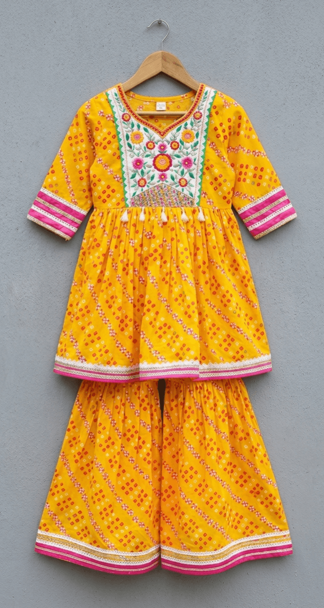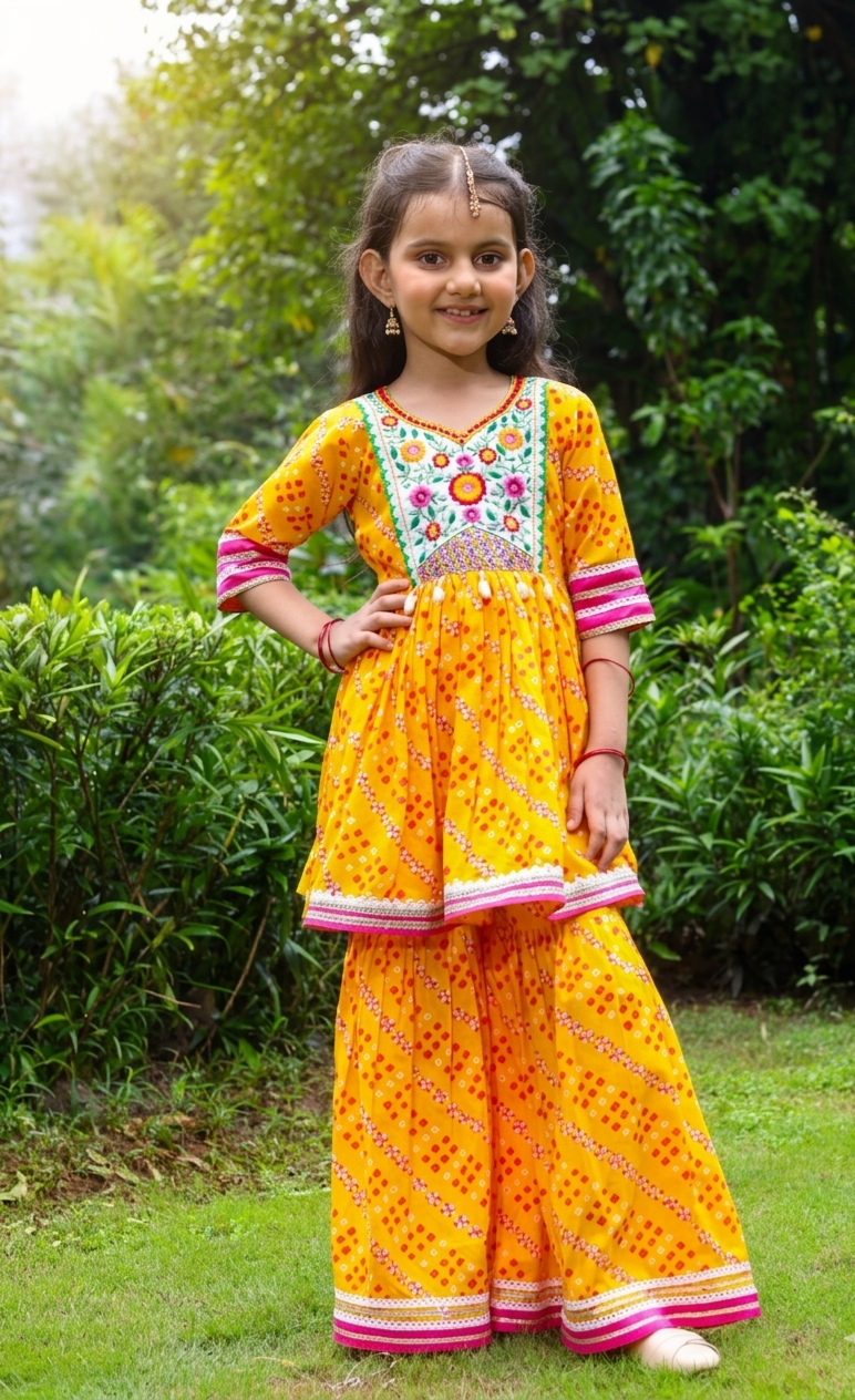 This bright yellow embroidered top with sharara pants set for girls is a striking festive outfit perfect for weddings, receptions, and cultural celebrations. Featuring a V-shaped neckline with intricate multicolored floral embroidery, delicate tassels, and pink-and-white striped borders, it pairs beautifully with wide-legged pants in a matching geometric floral print. Designed to balance tradition with modern elegance, this set ensures your child looks radiant and feels comfortable. Explore more in our kids ethnic wear collection.