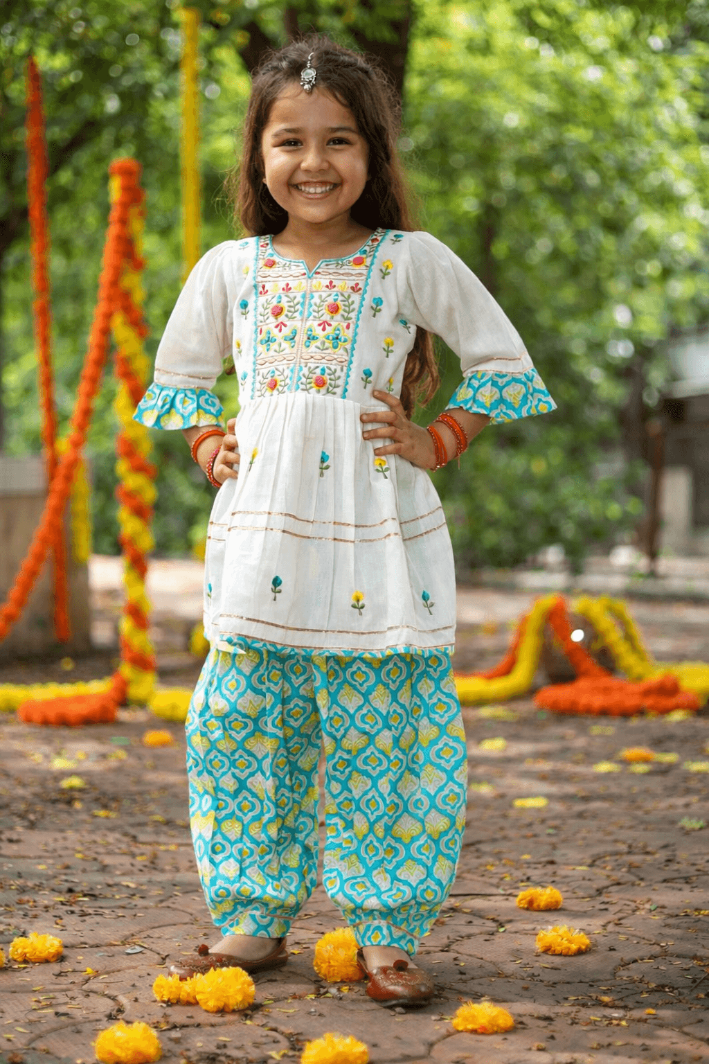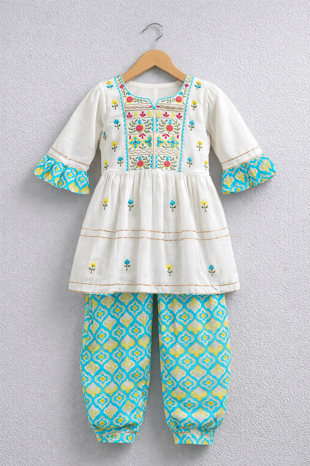 This off white embroidered tunic with turquoise patterned pants set for girls is a graceful ethnic outfit perfect for weddings, festive occasions, and cultural celebrations. Featuring colorful floral embroidery on the chest, scattered floral motifs, and flared sleeves with geometric borders, it pairs beautifully with turquoise pants adorned with ornate yellow and white patterns. Designed to highlight traditional craftsmanship with modern comfort, this set ensures your child looks radiant and feels confident. Explore more in our kids ethnic wear collection.