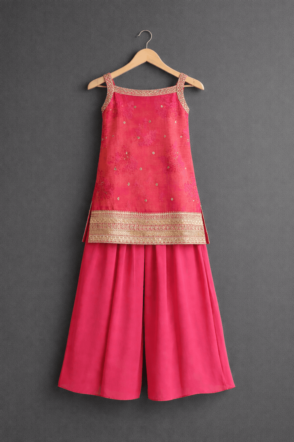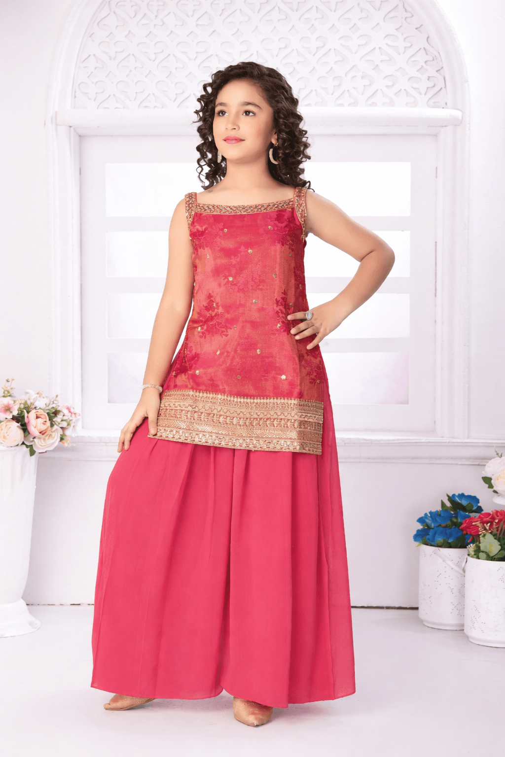This pink embroidered top with wide-legged palazzo pants set for girls is a sophisticated ethnic ensemble perfect for weddings, festive occasions, and cultural celebrations. Featuring a sleeveless square-neck blouse with golden embroidery along the neckline and hem, paired with wide-legged pants in a subtle floral silk pattern, it blends traditional artistry with modern elegance. Explore more in our kids ethnic wear collection.