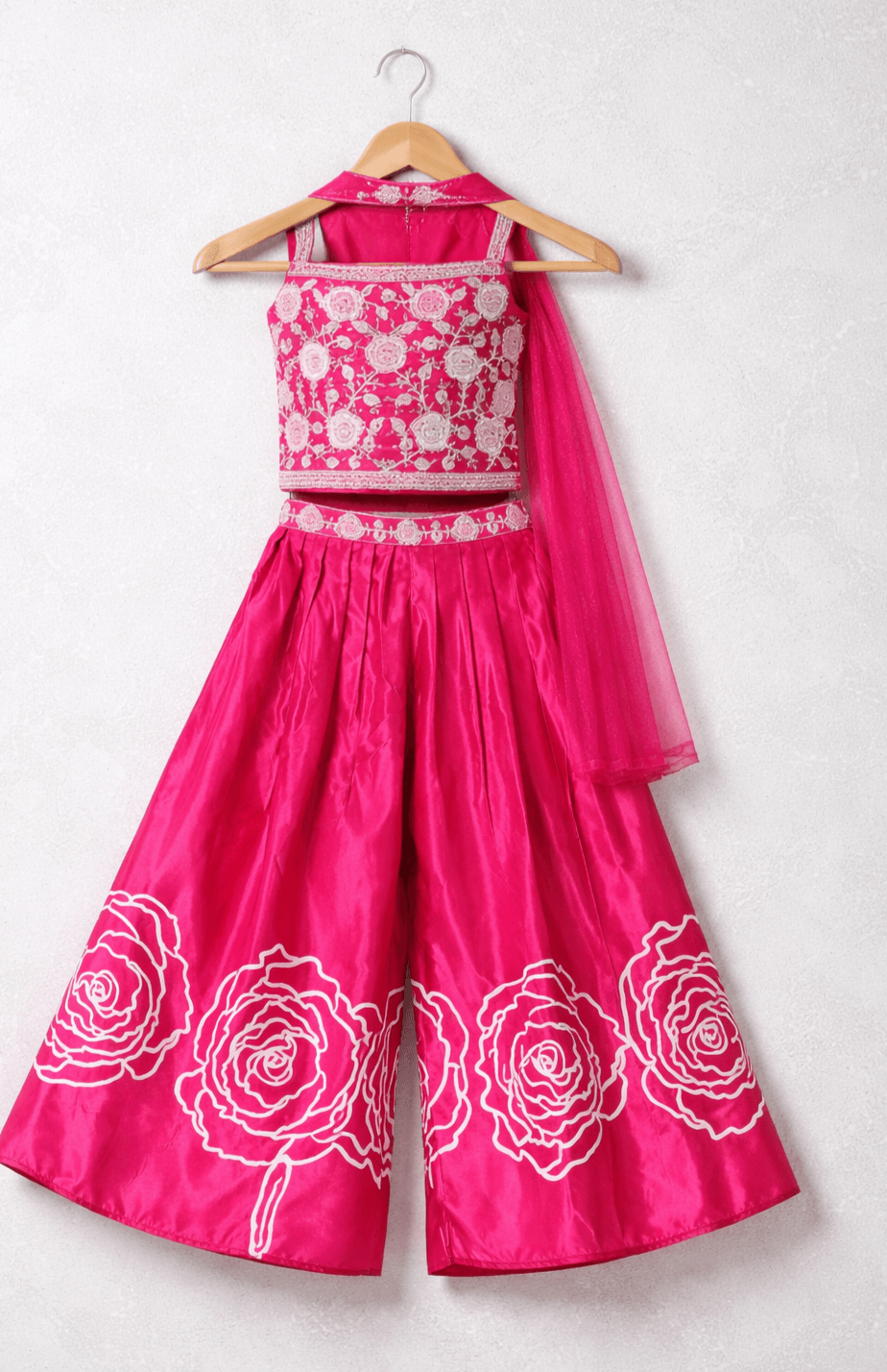 This bright pink embroidered tunic with wide-legged pants and dupatta set for girls is a vibrant festive ensemble perfect for weddings, receptions, and cultural occasions. Featuring intricate white floral embroidery on the sleeveless top, wide-legged pants with bold rose motifs at the hem, and a sheer matching dupatta, it blends traditional elegance with modern flair. Explore more in our kids ethnic wear collection.