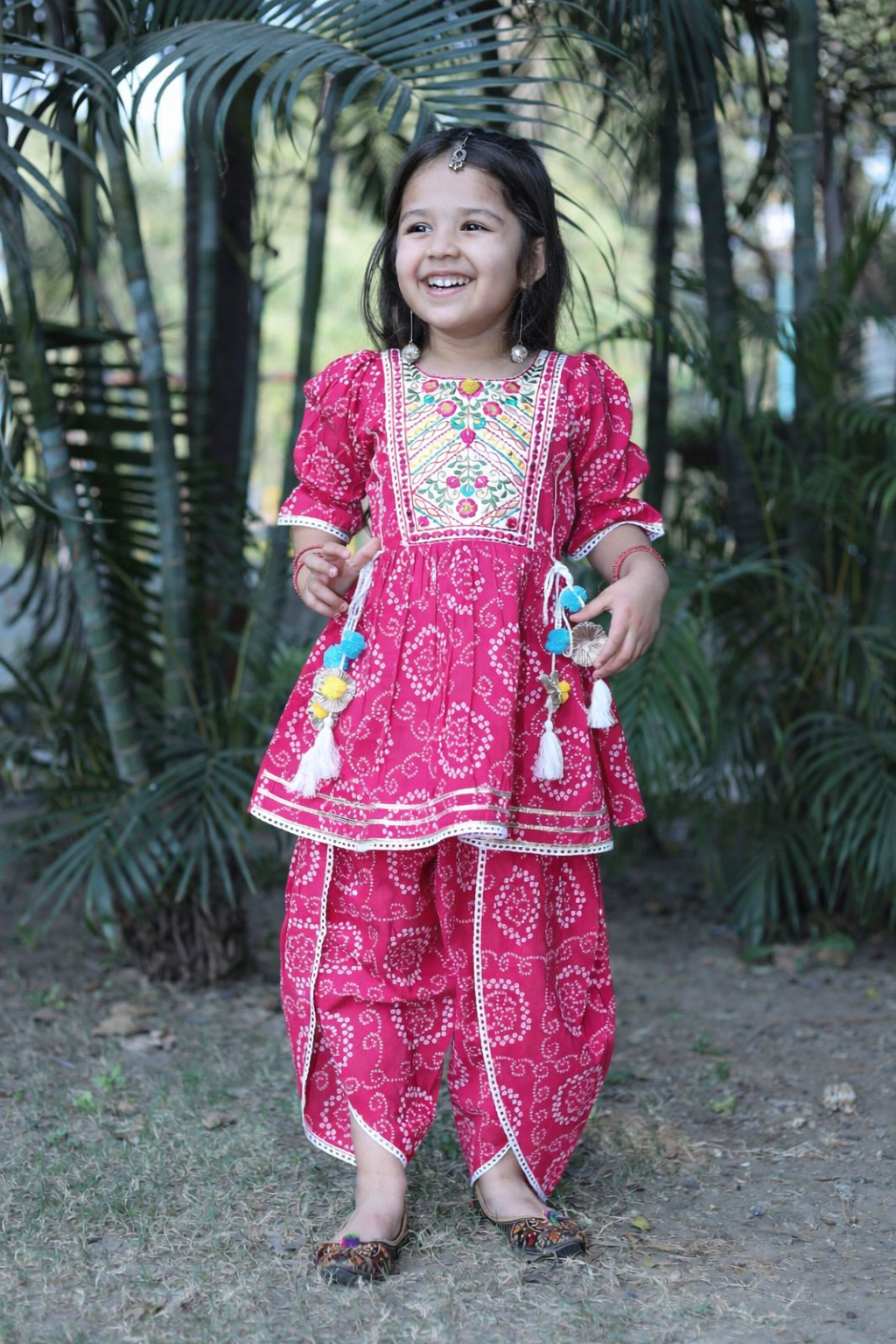 This bright pink embroidered Kurta set with dhoti  pants for girls is a festive showpiece designed for weddings, cultural occasions, and family celebrations. Featuring intricate floral embroidery on the chest, decorative tassels at the waist, and geometric motifs throughout, it blends traditional artistry with playful elegance. Paired with matching pants and finished with white detailing, this outfit ensures your child looks radiant and feels comfortable. Explore more in our kids ethnic wear collection.
