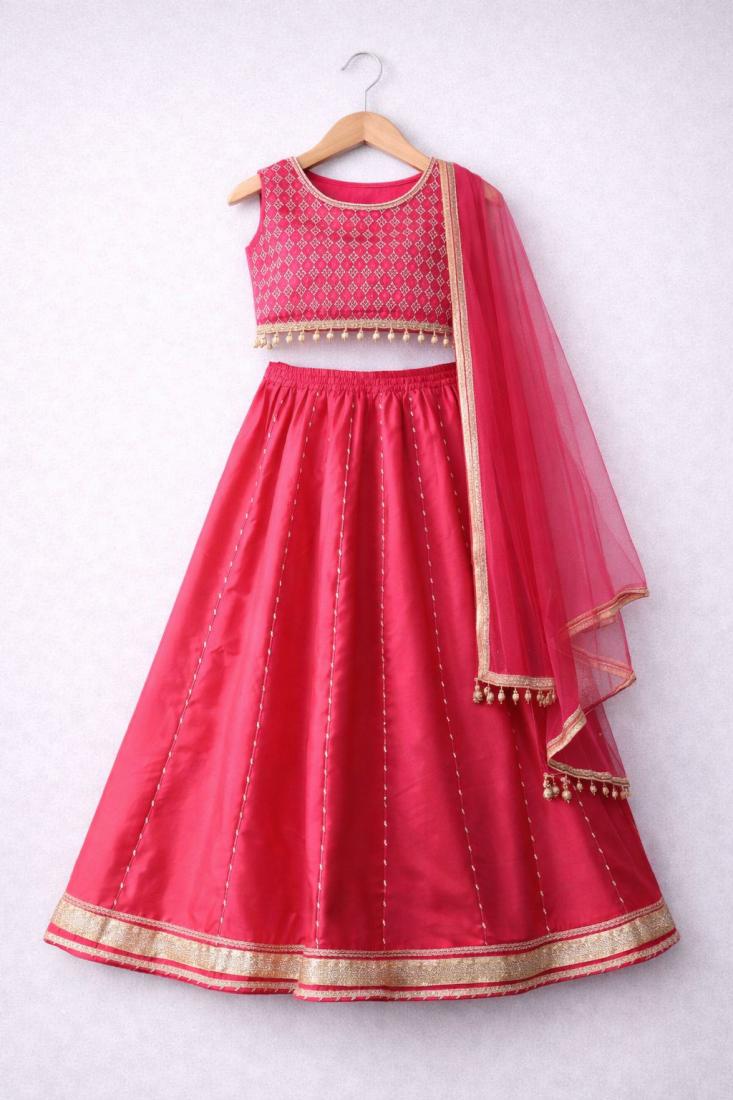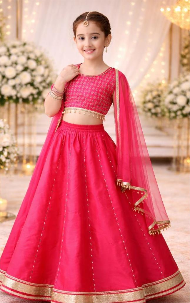 This rani pink lehenga choli for girls is a perfect ethnic outfit for weddings, festivals, and special occasions. Designed with beautiful traditional detailing and vibrant color, it gives a rich and festive look while keeping your child comfortable throughout the day. Explore more styles in our girls ethnic wear collection.