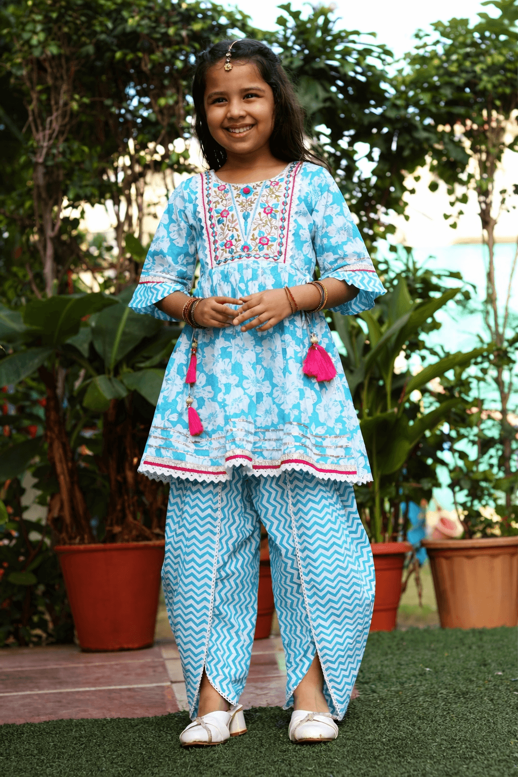 This sky blue floral embroidered tunic with zigzag pants set for girls is a vibrant ethnic outfit perfect for weddings, festive occasions, and cultural celebrations. Featuring multicolored embroidery around the neckline, bright pink tassels, lace-trimmed edges, and a unique overlapping pant design, it blends traditional craftsmanship with modern flair. Explore more in our kids ethnic wear collection.