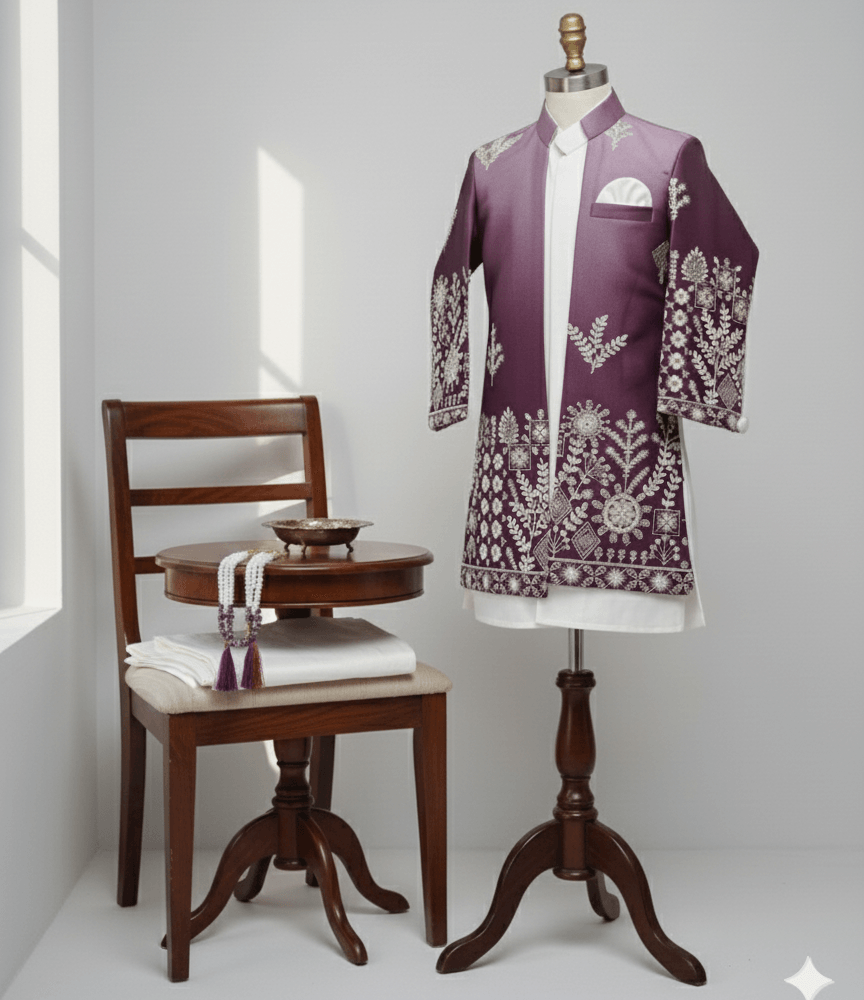 STITCHKAA presents this regal boys’ sherwani in wine purple, adorned with intricate white floral and geometric embroidery. Crafted with premium fabric and styled with a white cotton silk kurta and pocket square, this outfit is perfect for weddings, festive occasions, and cultural celebrations.