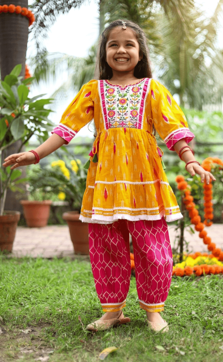 This bright yellow embroidered A-line pure cotton Kurta with pink patterned pants set for girls is a festive and vibrant outfit perfect for weddings, cultural occasions, and family celebrations. Featuring long sleeves with geometric patterned cuffs, a flared skirt portion, and a decorative embroidered chest panel with colorful floral designs, it pairs beautifully with pink lattice-patterned pants trimmed in yellow. The ikat-style motifs and intricate detailing make this outfit a standout choice. Explore more in our kids ethnic wear collection.